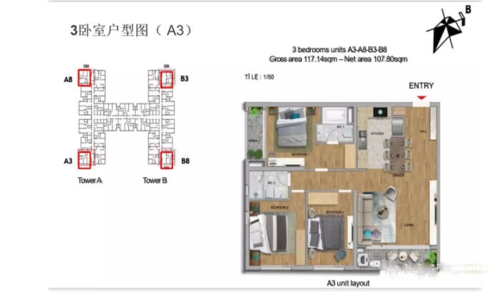 三卧室公寓: