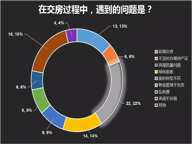 关于昆明楼市交房维权问题的调查,究其原因受访者们各持己见。在纠纷中最常见的问题有:延期交房;房屋装修有质量问题;绿化不达标;物业管理不负责等。 其中,房屋质量、绿化问题和承诺不兑现几乎都是房屋交付时存在的普遍问题。
